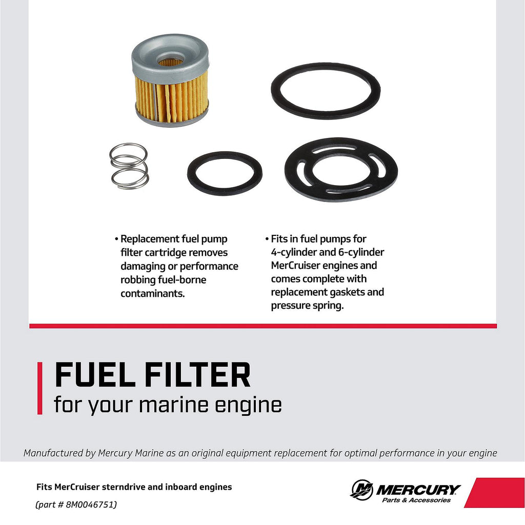 Mercury Precision 8M0046751 is a fuel pump filter for supported gasoline MerCruiser sterndrive engines including 2.5L, 3.0L, 3.7L, 3.8L, and 4.3L applications. It includes the filter canister plus sealing components for fuel system service on supported engines.